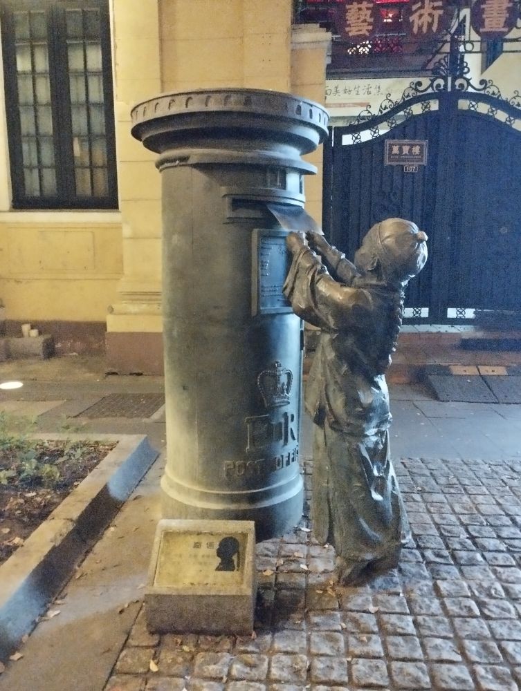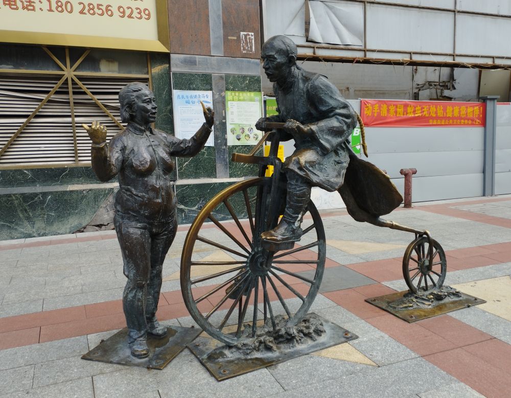 上下九街エリアでは、整備された繁華街の方も歩いてみた。まるで映画のセットのように整った騎楼建築を見上げる位置には、街の文化や歴史と結びついた彫刻作品がいくつも配され、街並みに変化を添えていた。北京の王府井にも銅像が配されているが、ここでも銅像たちは、ユーモラスなシーンを表したり、時には座る場所を提供したりと、いろんな意味で街を訪れた者たちに憩いをもたらしていた。
