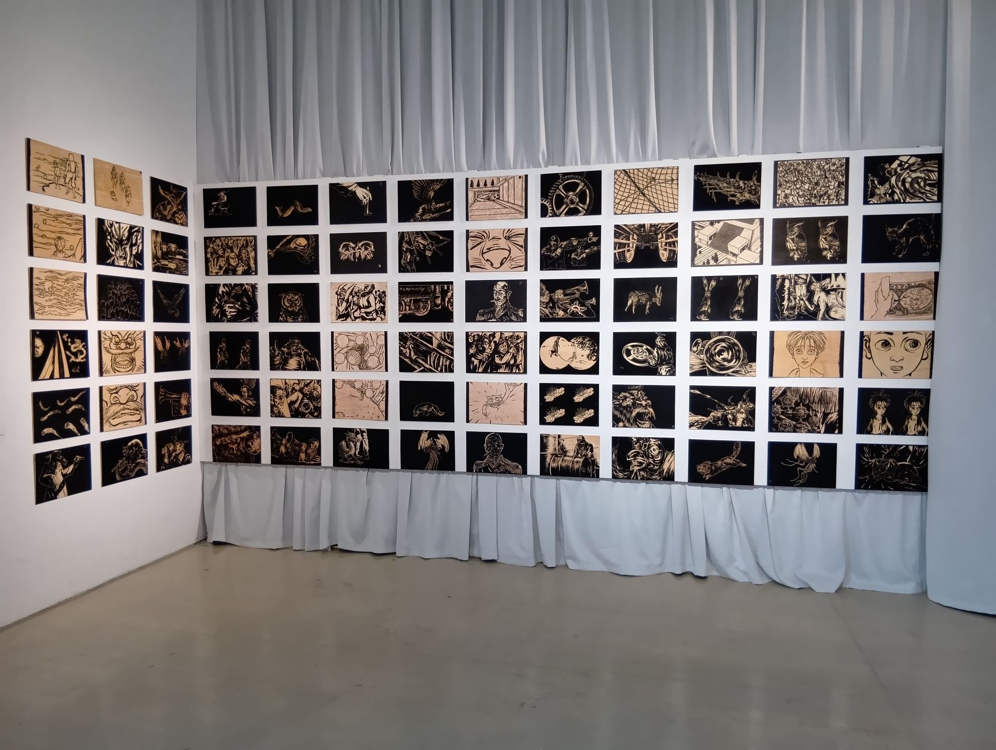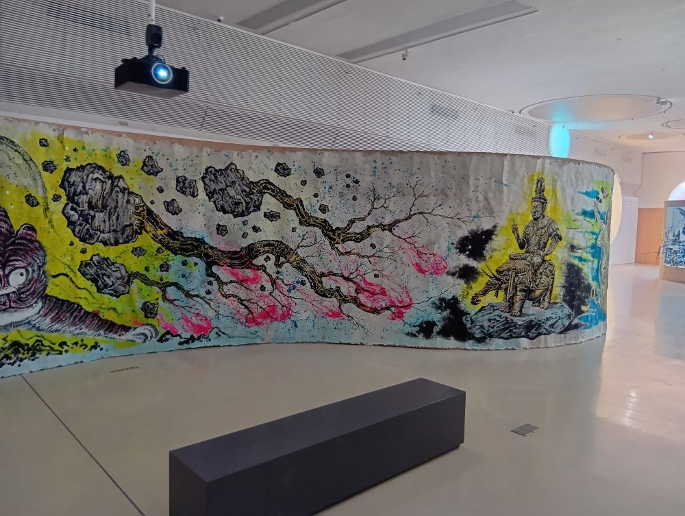 まず広いホールでは勢いのある筆遣いで描かれた大型の絵巻物風の水墨画などが順に展示され、次に木版画から漫画風のタッチに至るまでのさまざまな作風の絵が並んでいた。バーチャルリアリティや過去のビデオの作品もあり、さらに進むとフィルムが上映されている空間があった。その画面を目にして初めて、これまで観ていた絵画はアニメーションの原画だったと判明する。